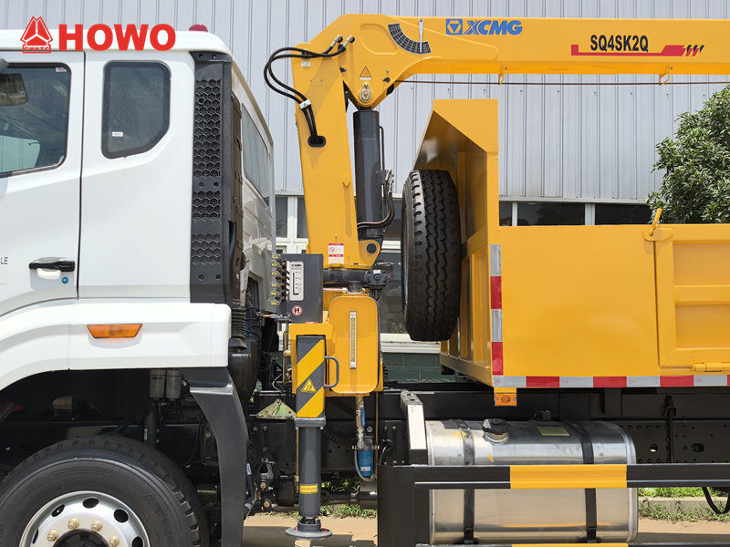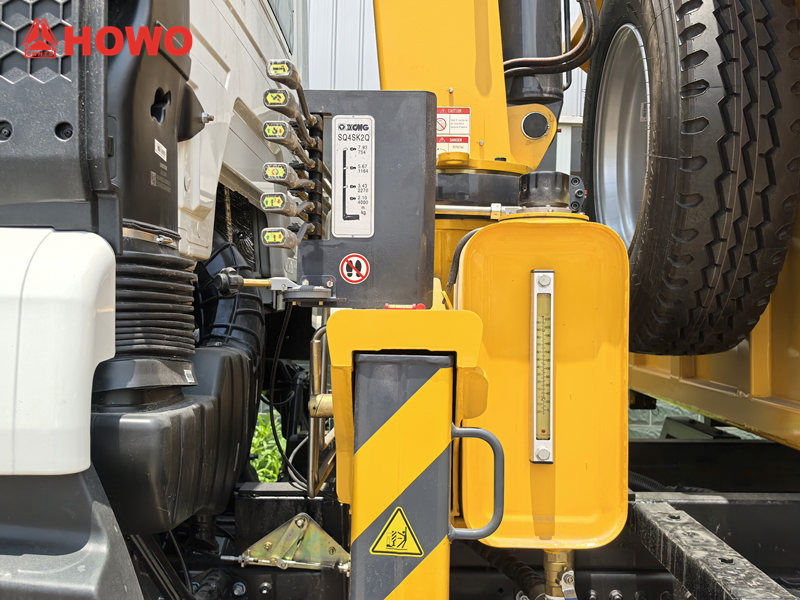 The Howo truck with a 4-ton crane lift features a telescopic boom crane with a large reach and wide operating radius, making it easy to lift a variety of heavy objects. Its built-in hydraulic system provides flexible operation, strong load capacity, and high lifting efficiency. The truck also features a dump function for quick material unloading, saving time and effort.