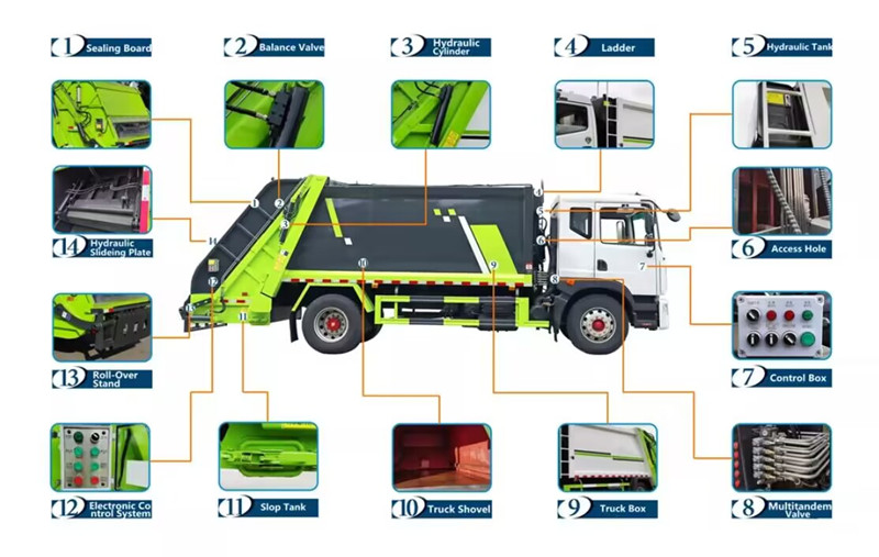 ●The 10m³ rear loder compactor consists primarily of a trash container, loader, compression push plate, hydraulic system, electronic control system, and tailgate.