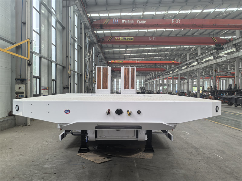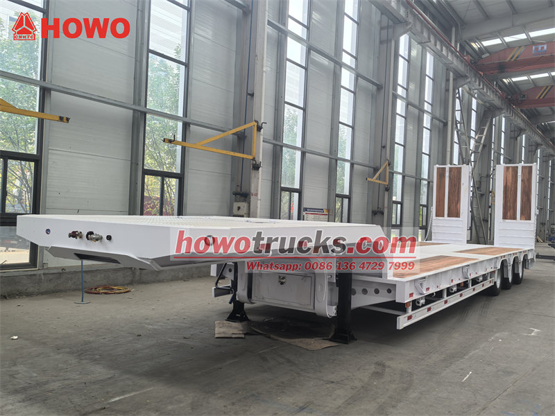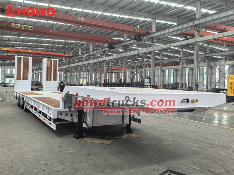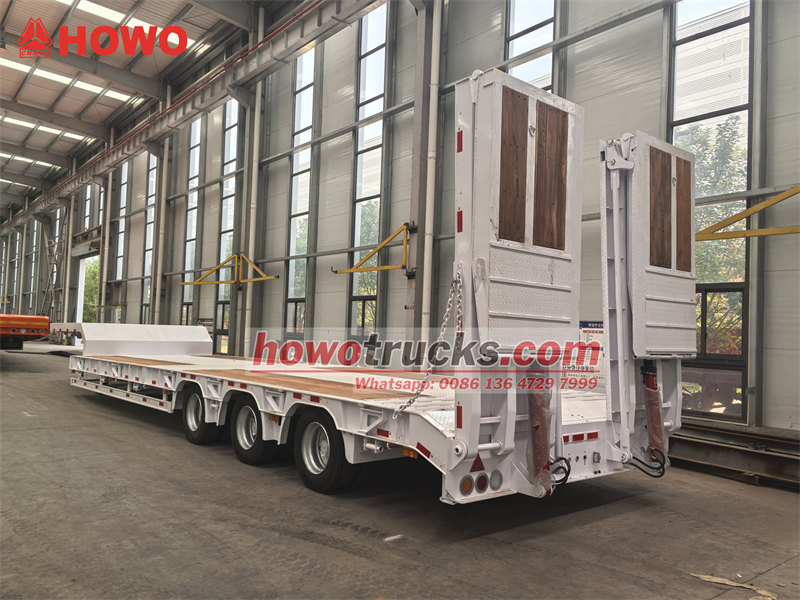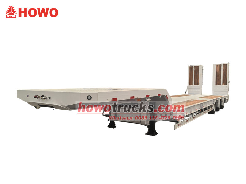 13 ton45-ton 3-axle lowbed trailer is a semi-trailer specially used for transporting large mechanical equipment, heavy cargo on highway, its low-bed structure design can effectively lower loading platform height, facilitate loading oversize, over-height cargo. This vehicle adopts 50# JOST fifth wheel coupling, equipped with 3 self-steering axles and air suspension with front axle lifting device, effectively improved empty load running stability and tire life. The hydraulic ramps and flatbed are paved with wood floor, which has function of both anti-slip and wear-resistant. The lowbed semi-trailer adopts Q355 high-strength steel main beams, undergoes epoxy anti-corrosion treatment. Compared with conventional low-bed, its air suspension, front axle lifting device, self-steering axles and wood ramp and flatbed design significantly optimized maneuverability and adaptability, especially suitable for precision equipment and high-demand transport scenarios.