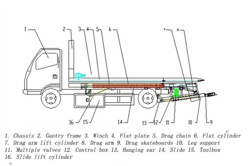 ●The flatbed road recovery truck superstructure primarily consists of a supporting arm, flatbed, winch, hydraulic system, auxiliary outriggers, and control devices.