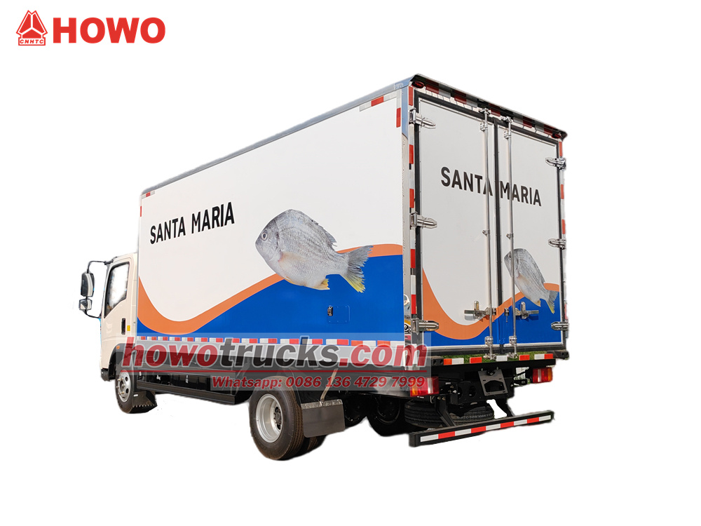 7200The 5Ton Seafood Refrigerated Truck Howo s a specialized cold chain transport vehicle, equipped with a Cummins ISF3.8s4R154 engine and a Wanliyang six-speed transmission, delivering powerful power and excellent fuel efficiency. The refrigerated compartment features a 105mm thick three-layer composite structure of FRP, PU foam, and FRP, offering excellent thermal insulation. Equipped with an HX-580 refrigeration unit, the unit offers a temperature control range of -18°C to +30°C, meeting diverse cold chain transport needs. Designed with practicality in mind, the vehicle features a single door on the right and double doors at the rear for easy loading and unloading. Primarily used for cold chain transport of seafood, the truck is customizable with regard to compartment size and refrigeration unit.