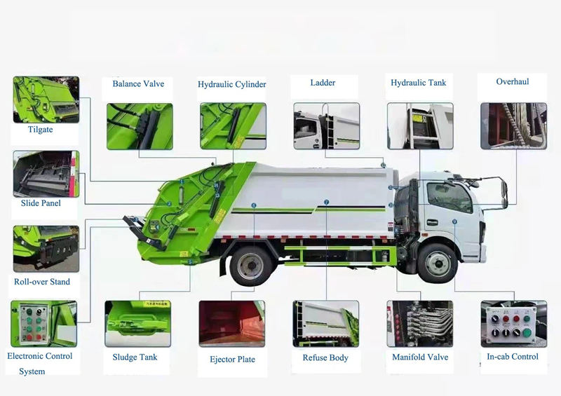 The Howo 10 CBM rear loader superstructure is the core of the vehicle, consisting primarily of the trash container, loader, push mechanism, hydraulic system, and electronic control system. Its operating principle is to compress trash into the container using a hydraulic push plate, significantly reducing volume and improving transportation efficiency. The superstructure is constructed of high-strength steel, ensuring excellent sealing, preventing leakage, and preventing the spread of odors.