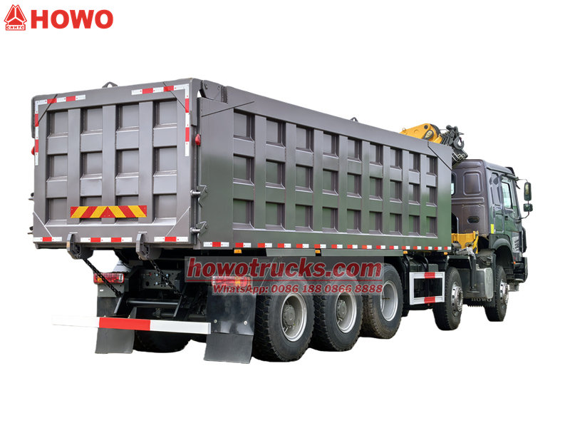 13000*3The Howo mining dumper with crane is built on the Howo heavy 10x4 drive chassis, equipped with WP12S400E201 diesel engine and a HW19710 10-speed gearbox. It has strong power performance and can adapt to complex working conditions. It is equipped the CS knuckle crane with a maximum lifting capacity of 8 tons.