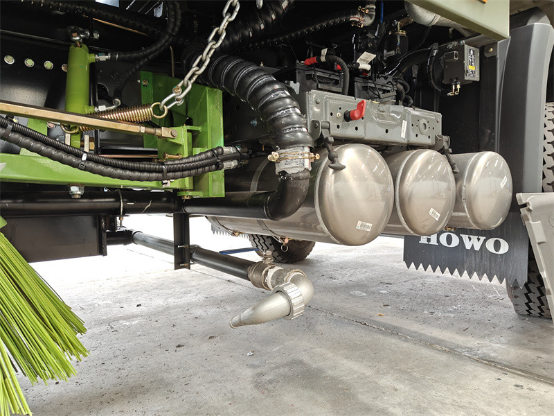 11500The Howo 12 cbm truck mounted street sweeper is a highly efficient sanitation vehicle designed for cleaning and maintaining urban roads, squares, industrial parks, and other locations. It features a 4,000-liter carbon steel water tank and an 8,000-liter stainless steel-lined trash bin. The sweeping system includes four sets of disc brushes and wide suction cups, enabling a sweeping width of up to 3.5 meters, a high-pressure flushing width of 2.5 meters, and a maximum sweeping capacity of 60,000 m³/h. The vehicle utilizes a German high-pressure pump, a Hangzhou low-pressure water pump, and a Weiye blower, combined with multi-stage spraying for dust suppression, resulting in low dust generation during operation.
