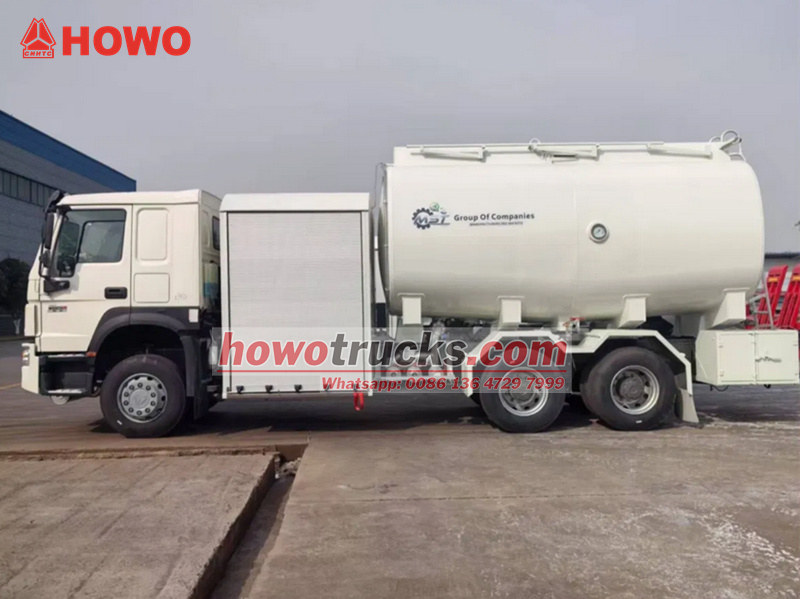 16000×2HOWO 20000L Aircraft Refueling Truck is a specialized aviation ground support vehicle built on HOWO 6×4 heavy-duty chassis. It is equipped with a 400HP Weichai engine and a 10-speed transmission, ensuring stable load-bearing capacity and maneuverability. The upper body consists of a 20-cubic-meter aluminum alloy fuel tank, equipped with a 1200-1500L/min self-priming centrifugal pump, a 5-micron filtration and separation system, and a dual-mode refueling system (pressure refueling by DN63 hydraulic hose reel and gravity refueling by DN38 fuel nozzle), enabling efficient aviation fuel delivery. The vehicle incorporates a Deadman control system, pressure control valves, and a magnetic-controlled refueling programmer, ensuring full-process safety management through aviation pressure-stabilized couplings, fuel vapor recovery interfaces, and explosion-proof electrical equipment.