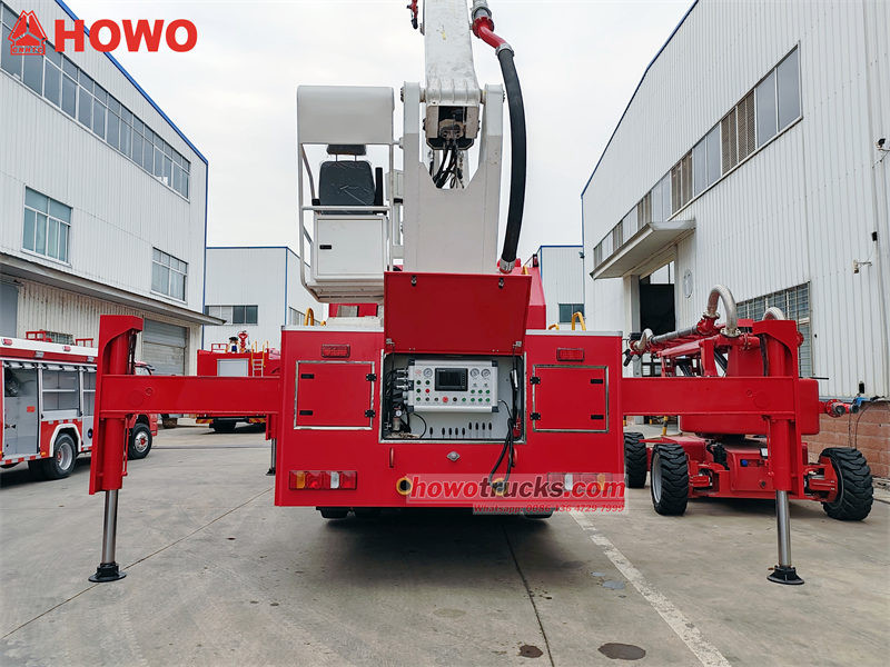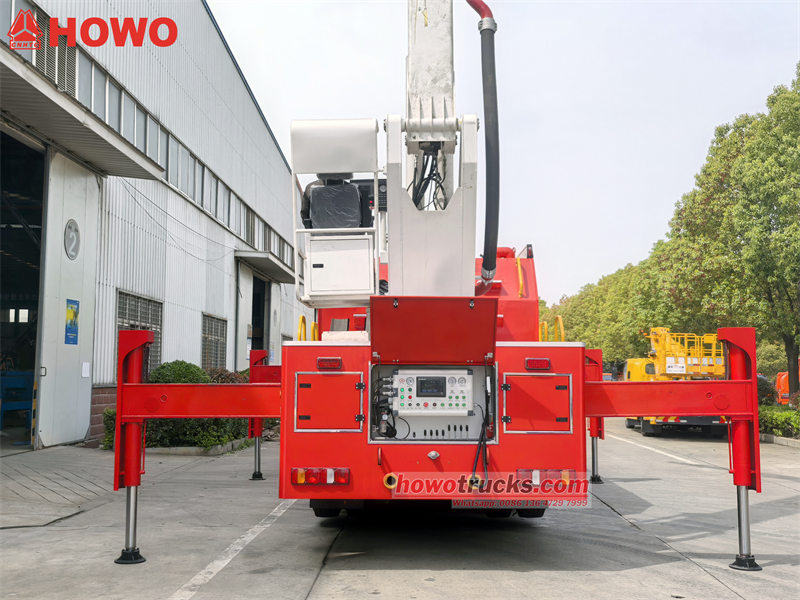 Howo 32m high-lifter fire water truck has two operating points: one at the rear control panel of the fire truck , the other for plugging in wired remote control.