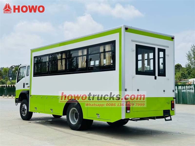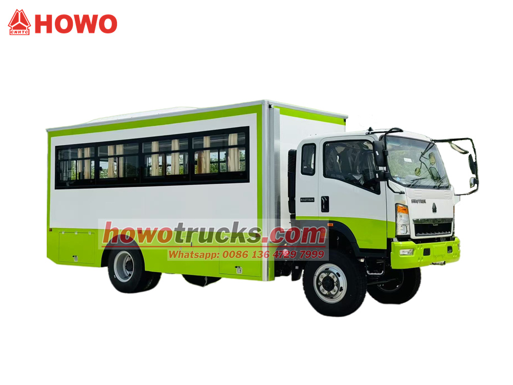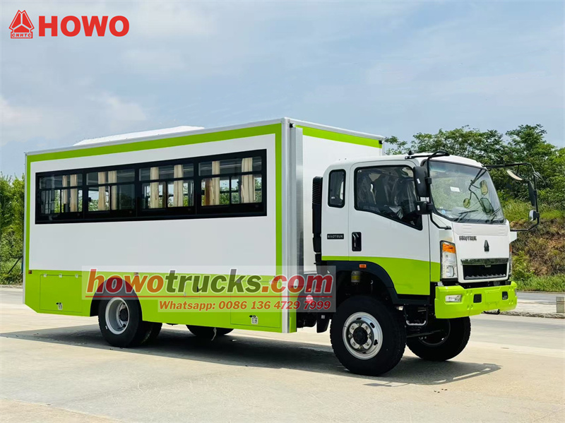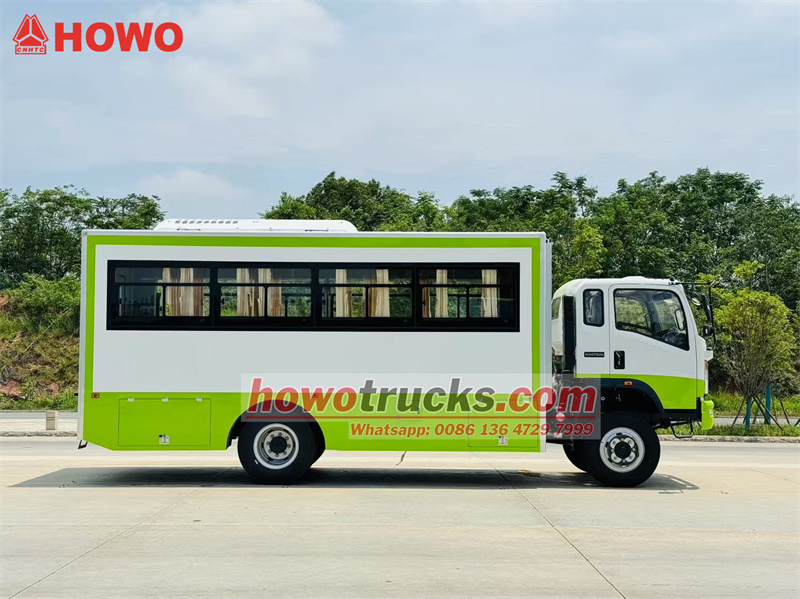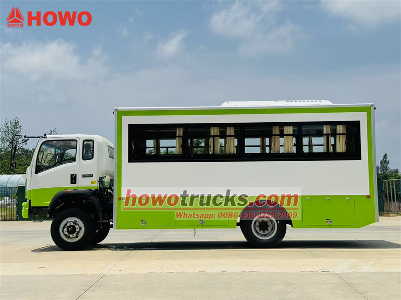 The HOWO 4x4 all-wheel drive troop carrier truck is modified from the HOWO all-wheel drive light truck chassis, with a 2080-row half cab, a 3800mm wheelbase, and is equipped with a Yuchai YC4E140-33 and a WLY6TS55 gearbox. The upper part is a troop carrier compartment with 22 seats, transparent windows and curtains on both sides, and a tailgate with a window for entry and exit. Luggage storage racks are installed on the top of the seats and are arranged on both sides of the compartment. The compartment is equipped with air conditioning and lighting, and tool boxes are installed on the lower sides of the compartment.