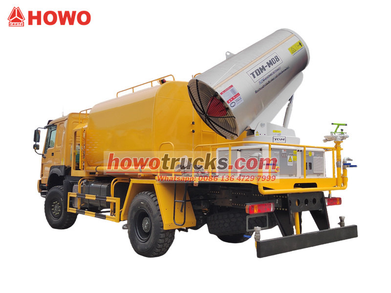 HOWO 4×4 water cannon truck is built on the HOWO all-wheel-drive chassis, equipped with a 300HP engine and a 4×4 drive system, delivering outstanding performance in complex terrains. Featuring an ultra-long-range 80-meter water cannon with 90 nozzles, it can spray fine water mist (20-200μm) with a maximum coverage area of 20,000㎡. Combined with a 10,000L large-capacity water tank and a high-pressure spraying system, it efficiently performs tasks such as road dust reduction, construction site dust suppression, and agricultural spraying. It is particularly suitable for dust control in mining areas, ports, urban environmental protection, and other fields.