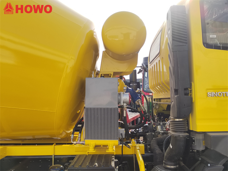 HOWO 5 cubic meter concrete mixer truck adopts HOWO 2080 row and half cab, with a total mass of 16 tons and a wheelbase of 3800mm. It is equipped with a SINOTRUK MC05.18-40 180 horsepower engine and a HW90510C 10-speed gearbox. The upper mixing tank has a capacity of 5 cubic meters and is made of Q355 manganese steel. The tank body is 4mm and the head is 6mm. It is equipped with a reducer, hydraulic pump and motor, radiator,air control box assembly, water tank capacity of 400L, air pressure water supply, double-sided control handles at the tail, linkage operation, and low residue rate.