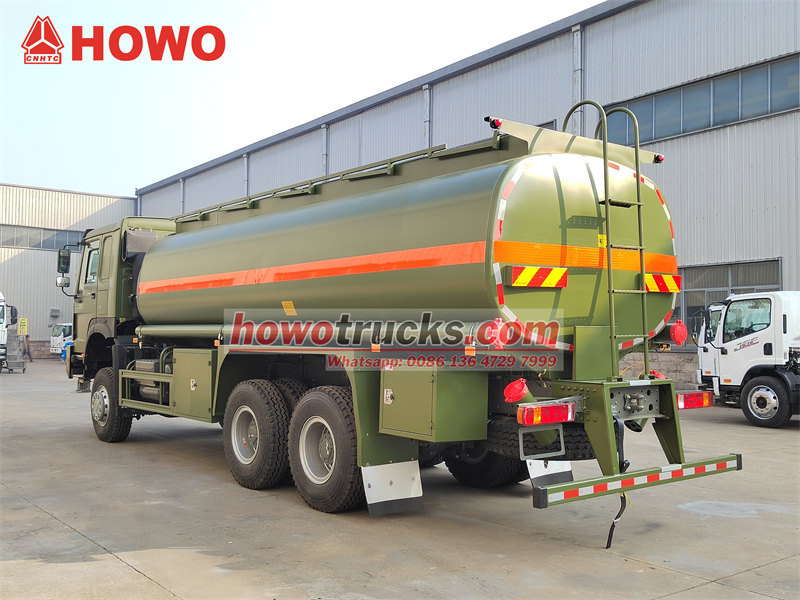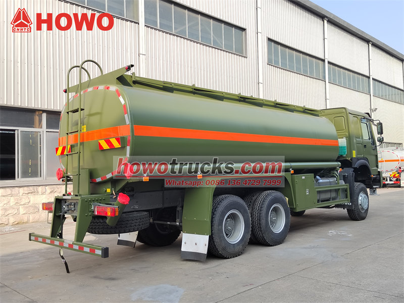 The HOWO 6×6 fuel tanker truck has a tank capacity of 18,000 liters and is constructed from 4mm-thick carbon steel with an internal anti-corrosion coating to extend its service life. The tank is divided into two independent compartments, allowing simultaneous transportation of different fuel types for enhanced operational flexibility. It comes with a high-capacity 60m³/h fuel pump and a 60L/min Censtar fuel dispenser, along with a 15-meter-long hose reel, enabling rapid refueling operations. With its outstanding off-road performance and Euro III emission standard, this vehicle is highly favored by African customers, particularly for fuel distribution in harsh environments such as oil fields and mining areas.