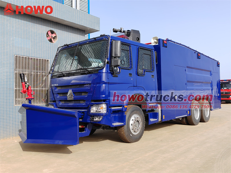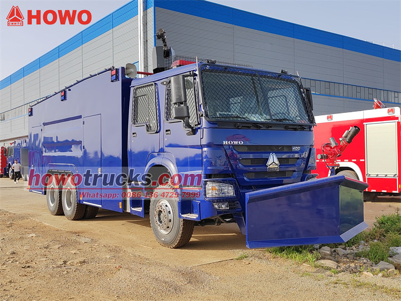 18000(2 axles)The HOWO armored crowd control riot truck is a premium 6x6 all-wheel drive, explosion-proof vehicle based on the Sinotruk HOWO HW76 double-cab heavy-duty chassis. It features an integrated explosion-proof body, a remote-controlled main cannon on top, and a fixed water cannon on the front. It supports multi-media spraying of high-pressure water, dye, and foam, with a range exceeding 70 meters, enabling three-dimensional riot control.