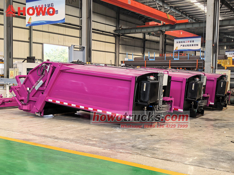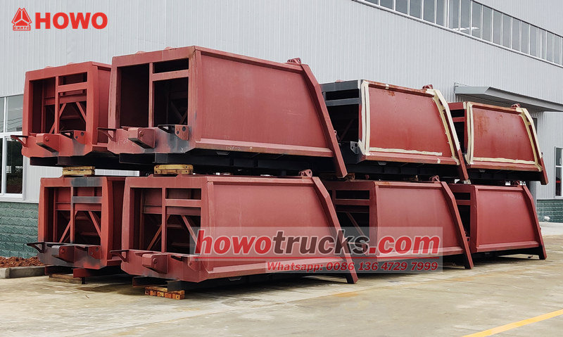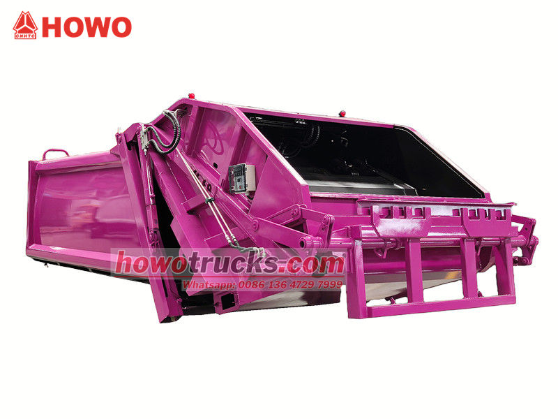 Howo 8cbm compaction garbage vehicle superstructure (also called rear loader compactor truck upper body, 8cbm trash compactor truck upper body kit, garbage compactor truck superstructure, waste compaction truck upper body kit, rear loader watse collection truck kit,etc.) the upper body is a 8cbm garbage bin,rear is a bucket flip mechanism,there are 3 methods to operation the truck loading and unloading.