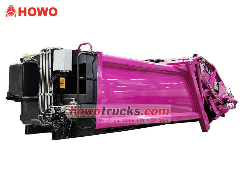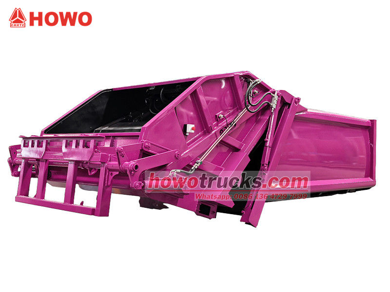 PLC control systemThe Howo 8 CBM compaction garbage vehicle superstructure consists of a garbage container, a loader, a pusher blade, a compression plate, and a hydraulic system. The container is welded from high-strength, corrosion-resistant steel plates, creating a hermetic seal to prevent wastewater leakage.