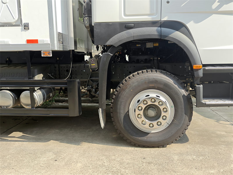 ♦ The classical Howo 4x4 chassis uses an electronically controlled transfer case to monitor wheel slip in real time and automatically distribute torque to the front and rear axles (0-100% infinitely adjustable).