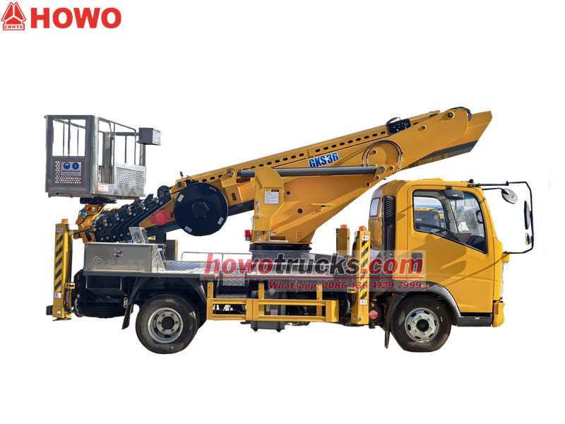 Its unique H-type hydraulic outrigger design is equipped with a two-way hydraulic locking mechanism to ensure stability during operation. The Howo manlifter truck is also equipped with a manual and wireless remote control dual operating system, with a platform rated load of 200 kg, 360° hydraulic rotation, and built-in multiple safety protection devices, such as automatic out-of-bounds limit, emergency stop device and leakage protection.