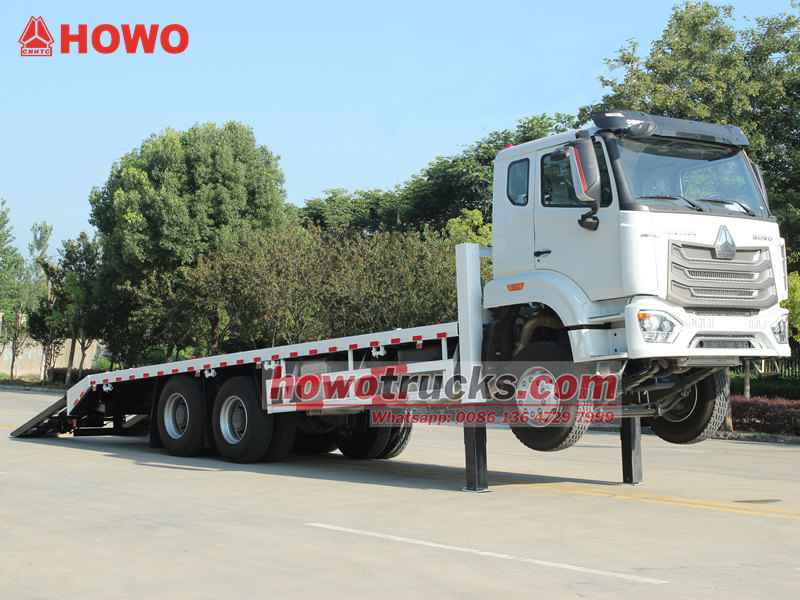 HOWO NX Self Loader Truck is a professional vehicle specifically designed for the transportation of large construction machinery. Built on a HOWO 6×4 drive chassis, it is powered by a 400HP Weichai high-pressure common rail engine, delivering robust performance with high efficiency and environmental compliance. The vehicle is equipped with an 8600×2500 mm anti-slip flatbed, two 20-ton front lifting hydraulic outriggers, and a 4-ton hydraulic winch, forming a safe and reliable loading and unloading system that fully meets the transportation and on-site operational needs of heavy excavators and other equipment.