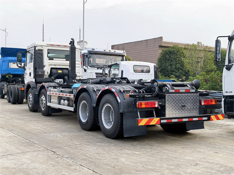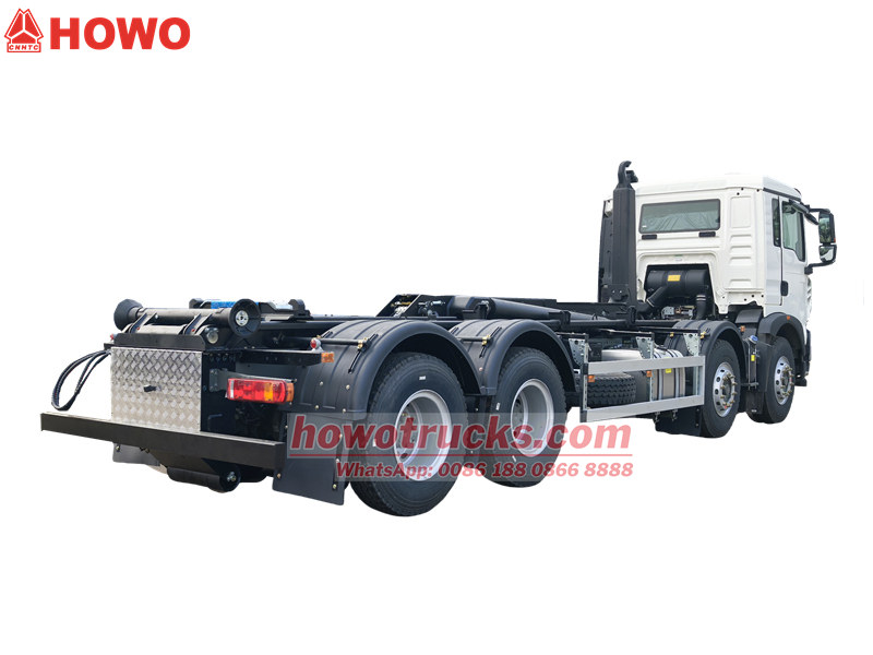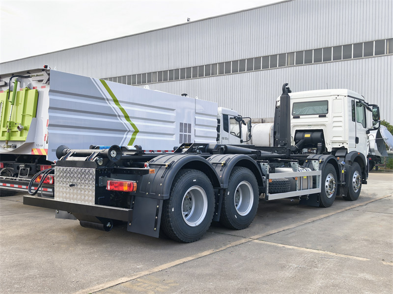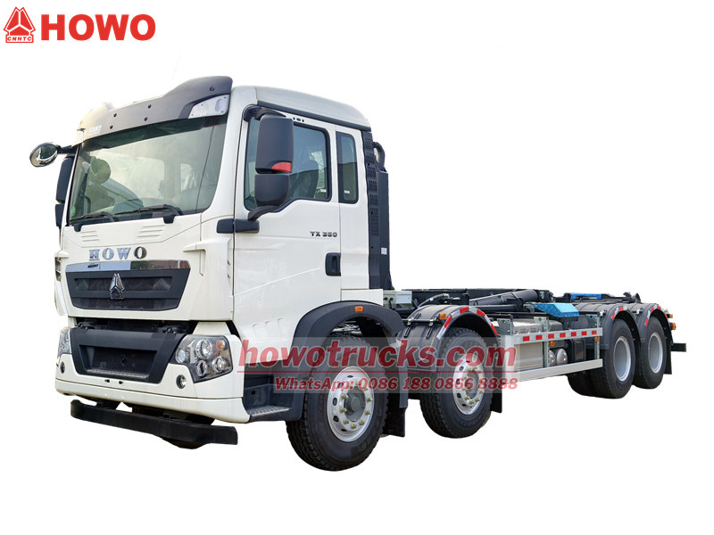 This is a high performance Howo TX heavy garbage hooklift truck, highlighting the precision engineering design of modern urban sanitation vehicles. Equipped with Weichai WP8.350E62 6-cylinder diesel engine with a rated power of 350HP, it is not only powerful but also environmentally friendly. The total mass of 33000kg, a load capacity of 20 tons, and a maximum speed of 105km/h.