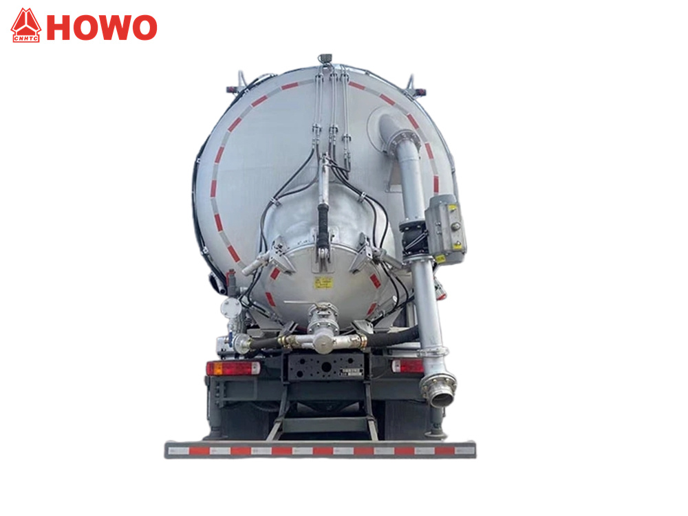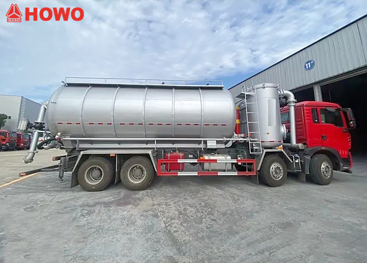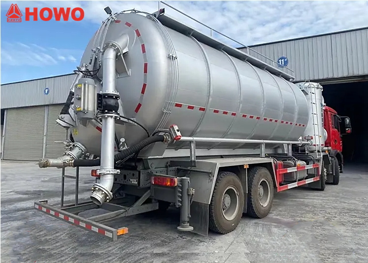 17500(2 axles)The HOWO TX dry vacuum tank truck is a versatile vehicle designed for transporting powdered and granular materials. Equipped with a 350-horsepower Sinotruk MC07H engine and an HW15710L transmission, the truck has a total tank capacity of 25 cubic meters and transports fly ash with a density of 0.48 tons per cubic meter. The truck is equipped with a tank, vacuum pump, air compressor, lifting cylinder, filtration system, hydraulic outriggers, suction and discharge piping, and other specialized equipment.