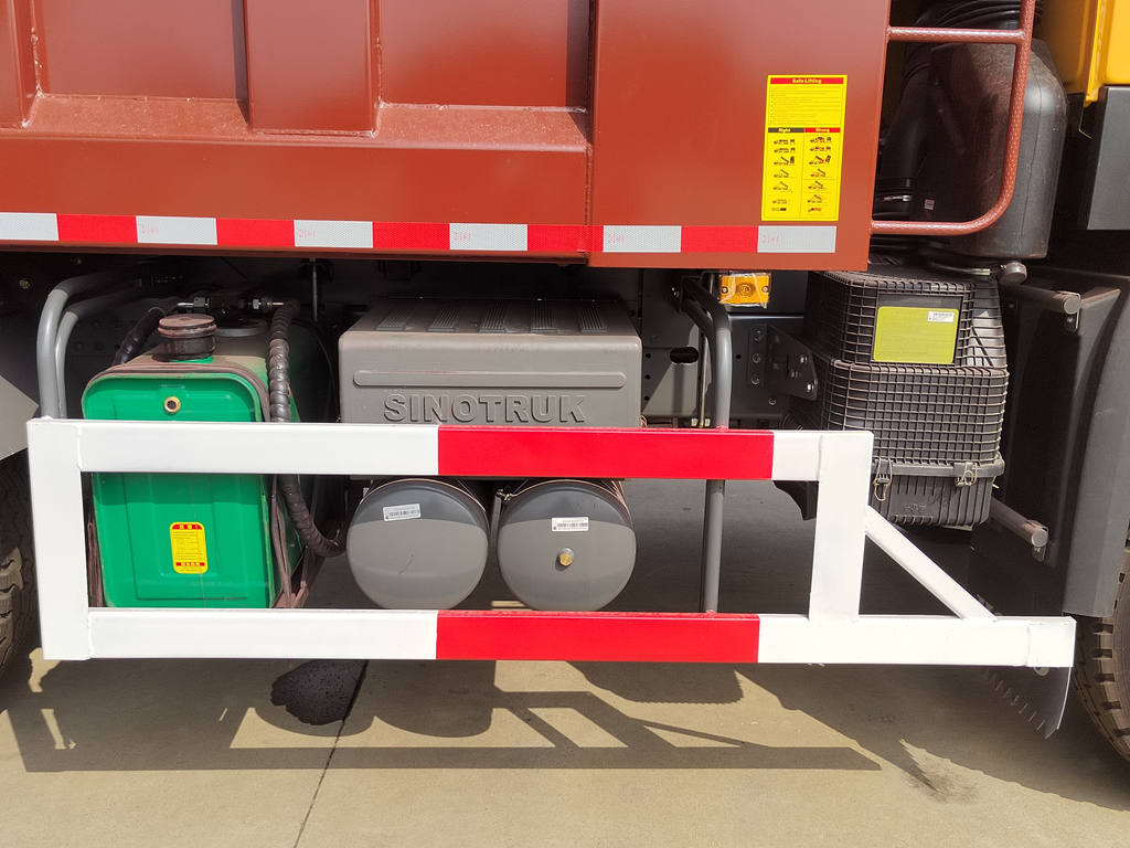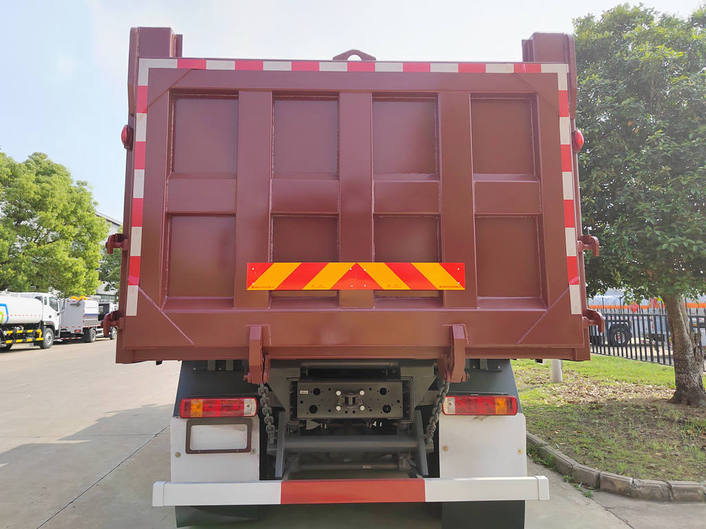 This Howo construction dump truck features a high-strength steel ladder frame, offering strong torsion resistance and excellent load-bearing capacity, making it suitable for handling bumpy construction sites. Its powerful lifting capacity and cargo bed tilt angle of 45-60° ensure quick and thorough unloading. The cargo bed can hold up to 30 tons and can be equipped with optional thickened steel plates or anti-corrosion coatings for extended service life. The rear door features an automatic locking design to prevent accidental opening during transport, enhancing safety.