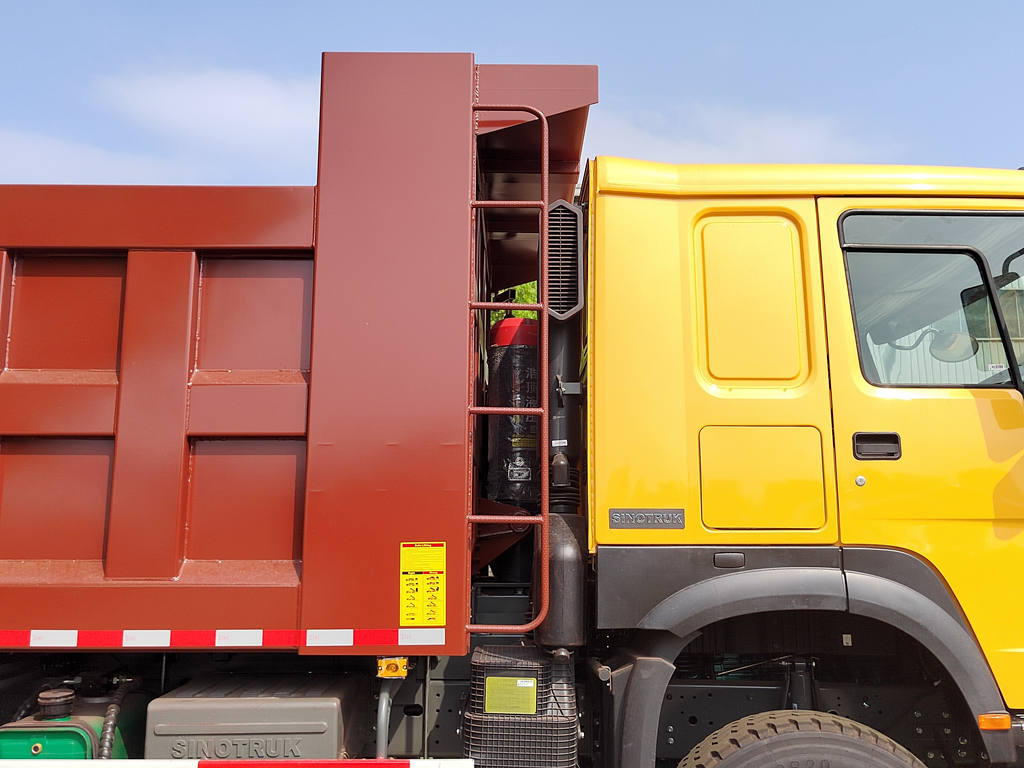 The Howo construction dump truck primarily consists of a chassis, hydraulic lifting system, cargo box, and control system. The cargo box is welded from high-strength steel plates, articulated at the front to the frame, and the rear can be hydraulically opened or features an automatic locking hook mechanism to ensure a tight seal during transport. The hydraulic system comprises an oil pump, multi-stage hydraulic cylinder, control valve, and fuel tank. Lifting and lowering of the cargo box are controlled via a joystick inside the cab.